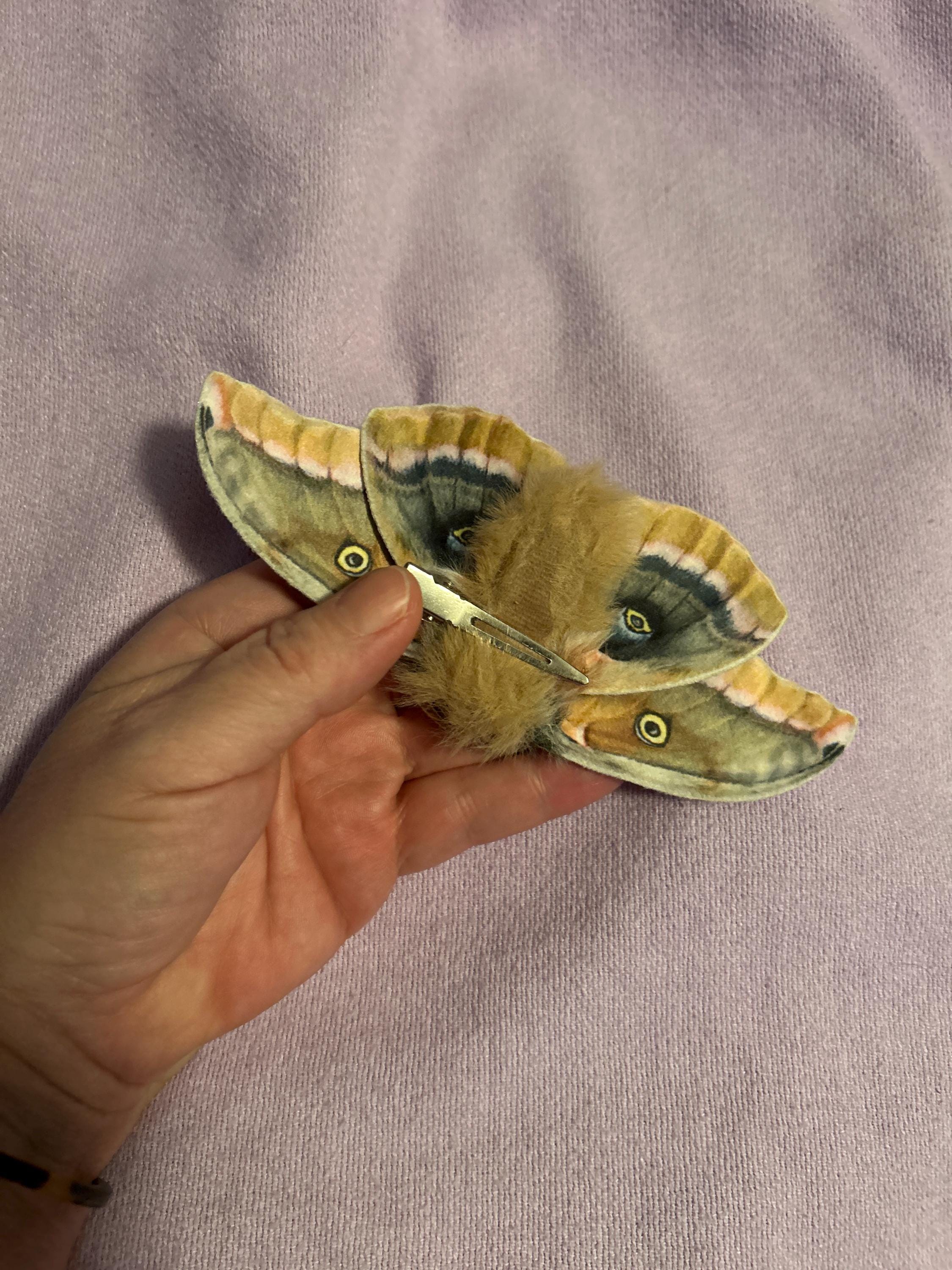 A large fake but realistic polyphemus moth for your hair or anywhere else you can think! The moth is a handmade textile replica made to look like a real moth. The wings are made from soft velvet-like fabric and the body is made from faux fur. The inside of the wings are wired so they are flexible, poseable and durable.