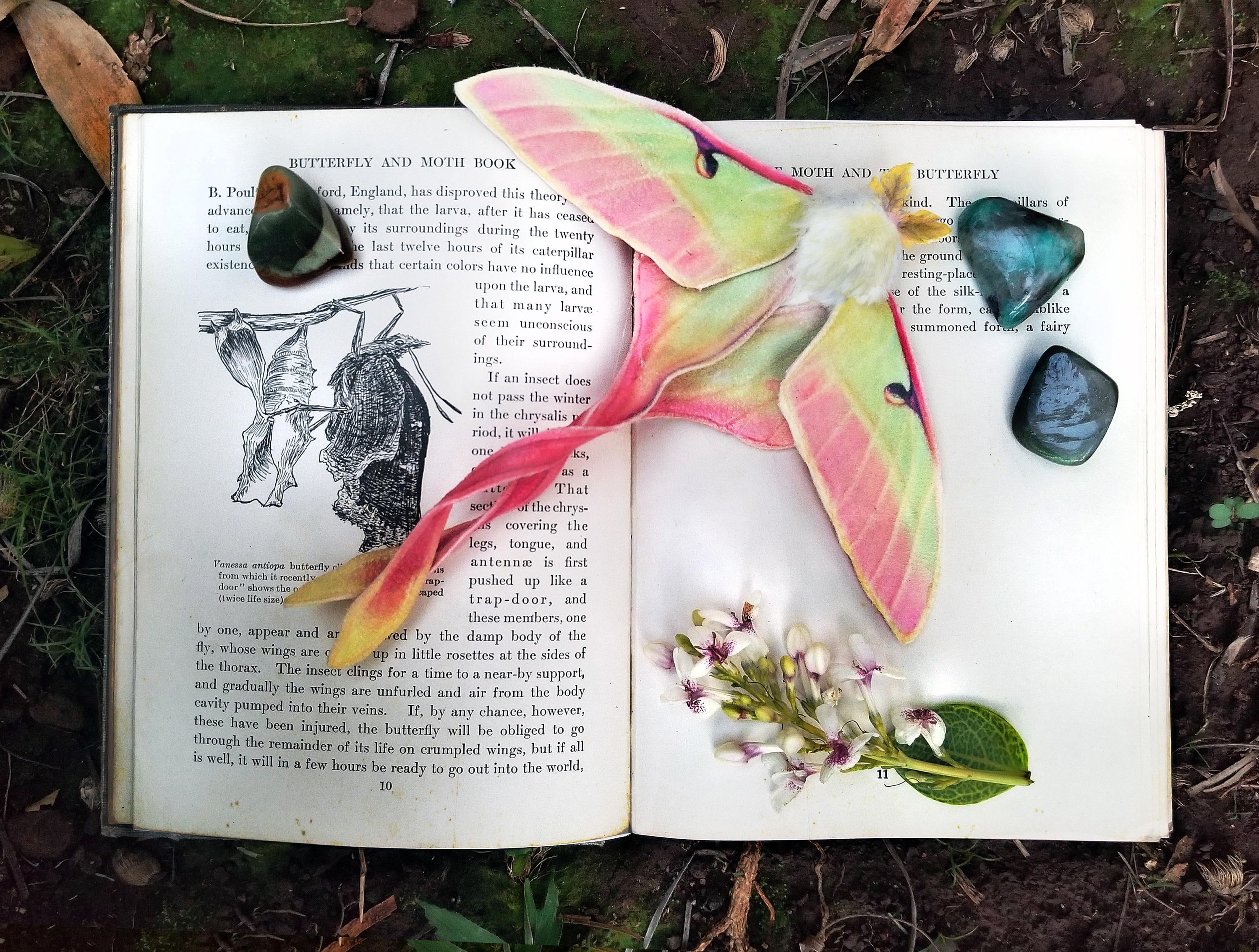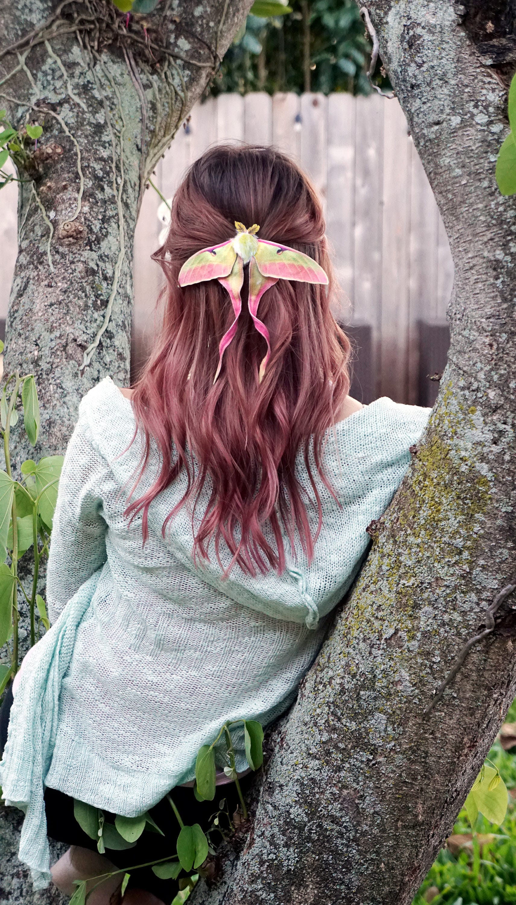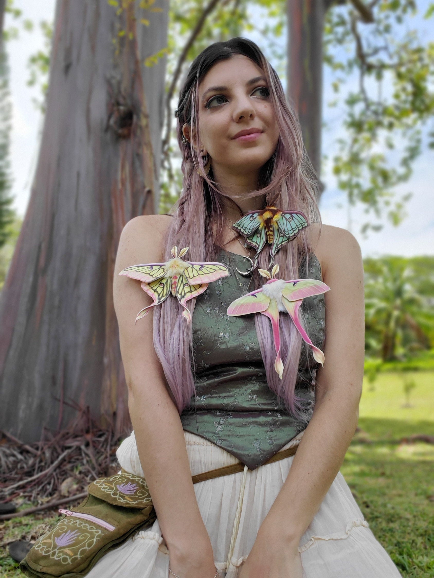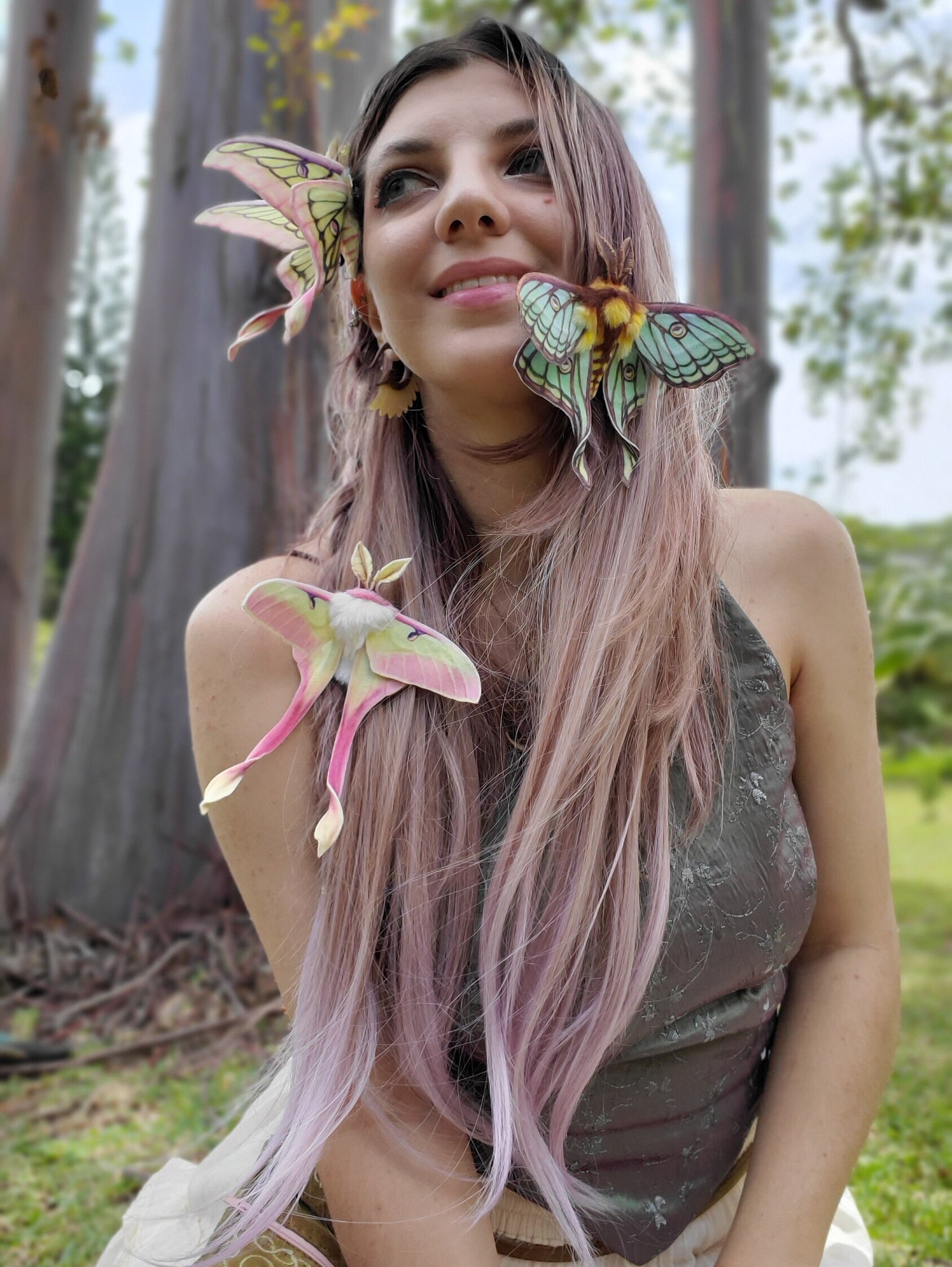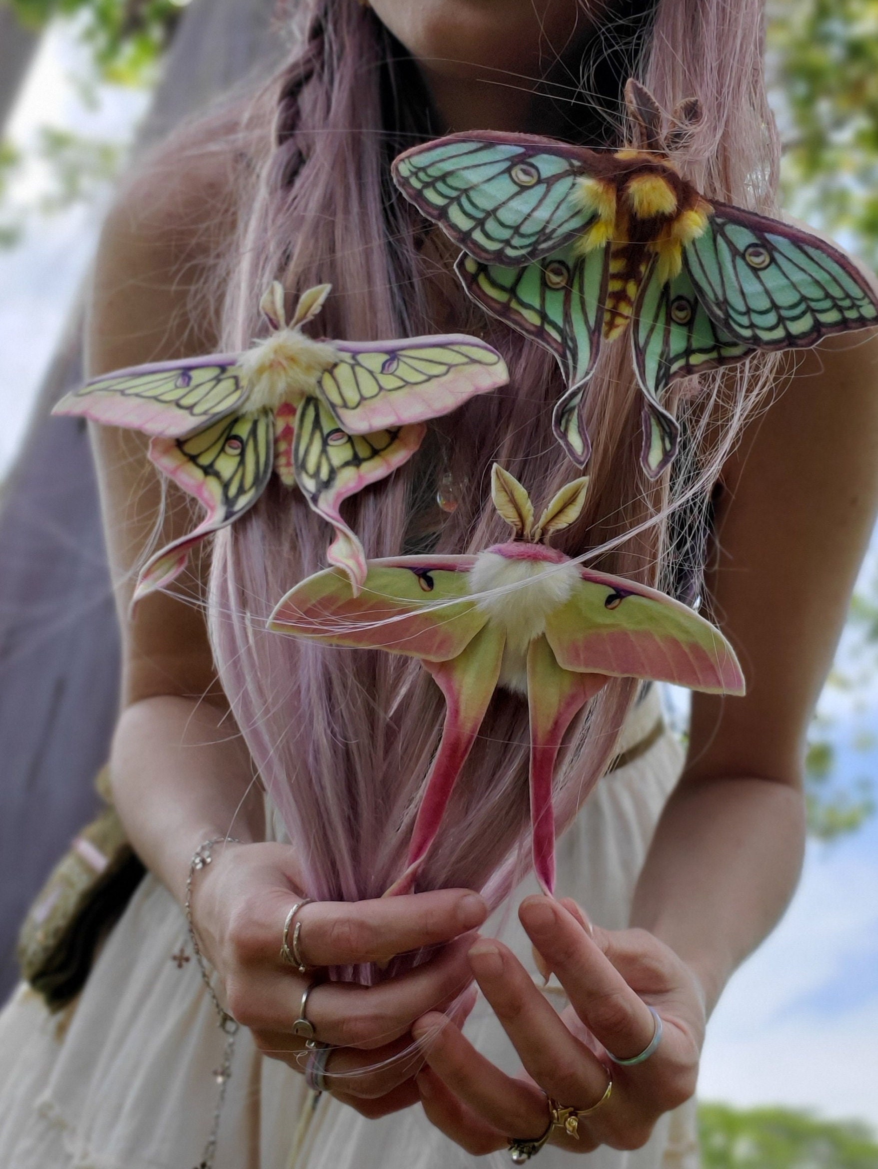 A large fake but realistic chinese moon moth (actias dubernardi) for your hair or anywhere else you can think! The body is fluffy white faux fur with slight tinges of yellow and the wings display hues of pink and yellow. The moth is a hand made textile replica made to look like a real moth. The wings are made from faux suede and the body from faux fur. The inside of the wings are wired so they are flexible and poseable. A beautiful piece of wearable art.