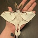 A large fake but realistic albino luna moth (actias luna) for your hair or anywhere else you can think! It resembles a normal luna moth but instead is a snowy white moonlight color to create the albino look. The moth is a hand crafted textile replica made to look like a real moth. The wings are made from soft velvet fabric and the body from faux fur. The inside of the wings are wired so they are flexible and poseable. A beautiful piece of wearable art.
