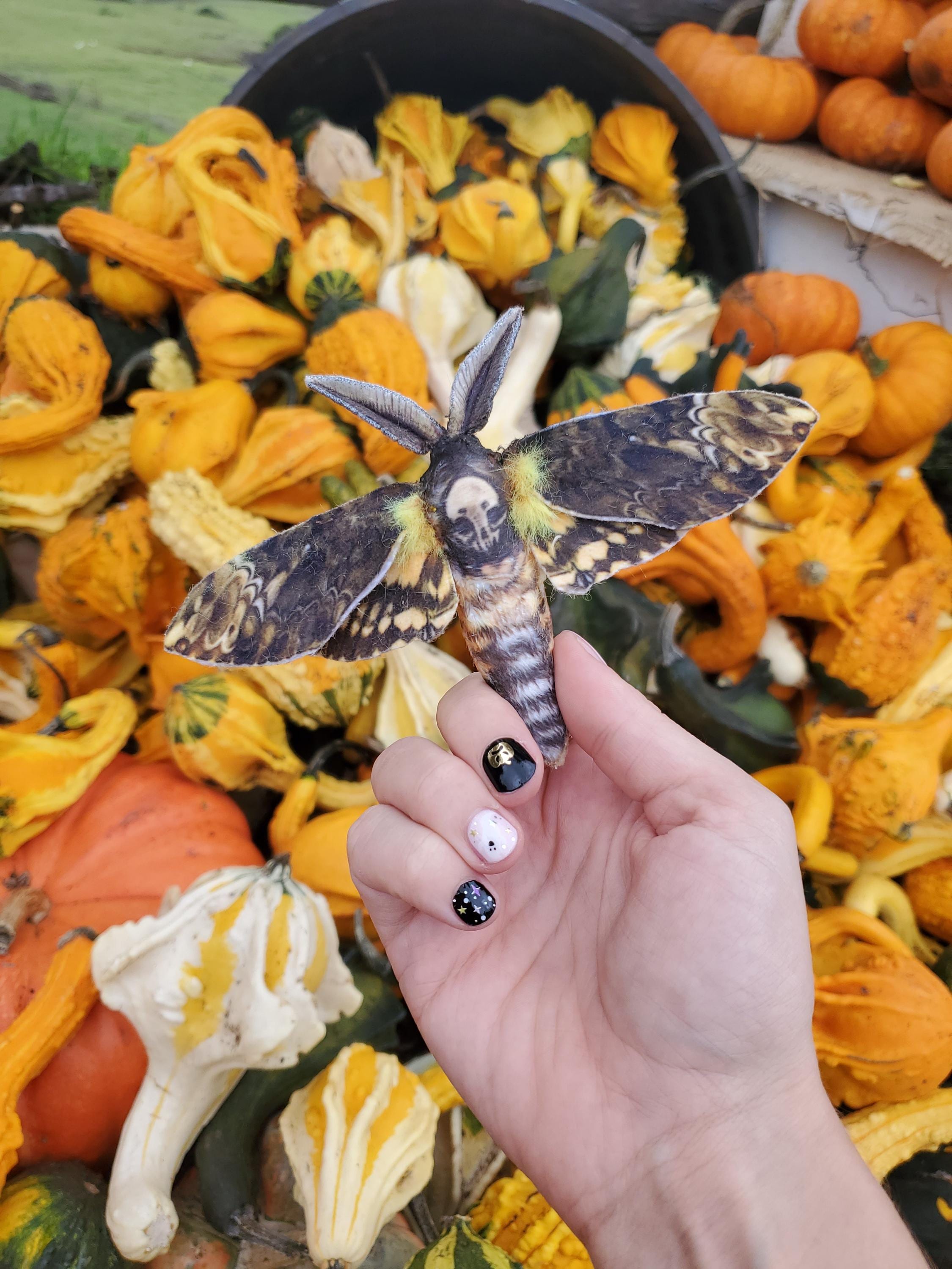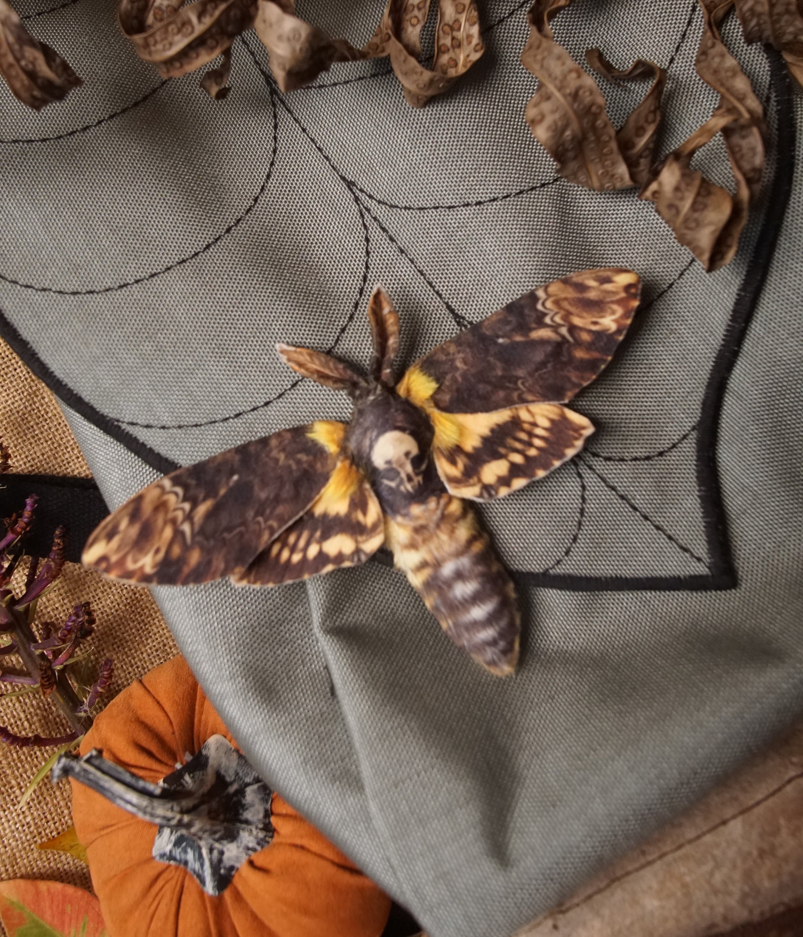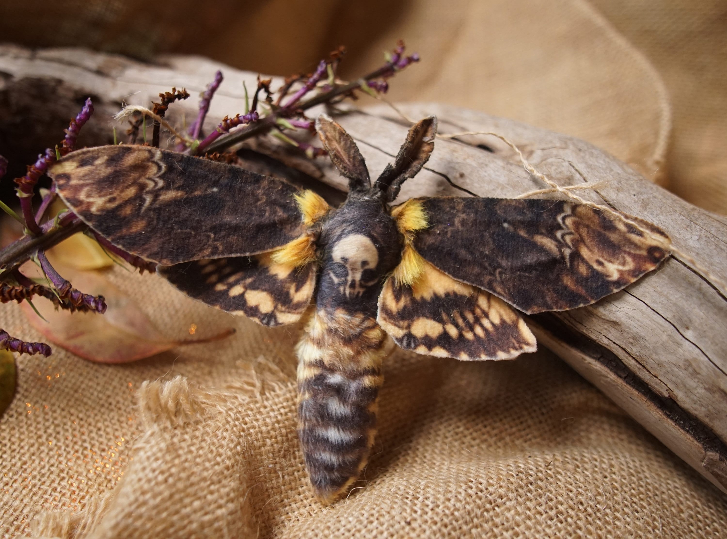 A fully handmade textile item based on the real death's-head hawk moth it has a soft body and a stylized skull on its head. It's a handmade, large, fake but realistic moth for your hair, as a brooch, or any other way you can think of! The wings are made from a soft fabric material and the fluffy body is faux fur with painted details to mimic the soft texture of a real moth. Made with all vegan materials. The inside of the wings are wired so they are flexible and poseable. This piece is one of a kind, wearable art!