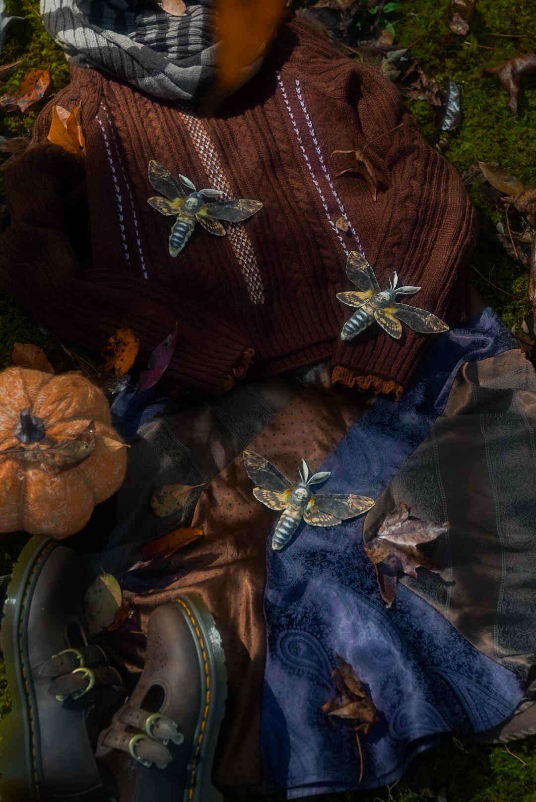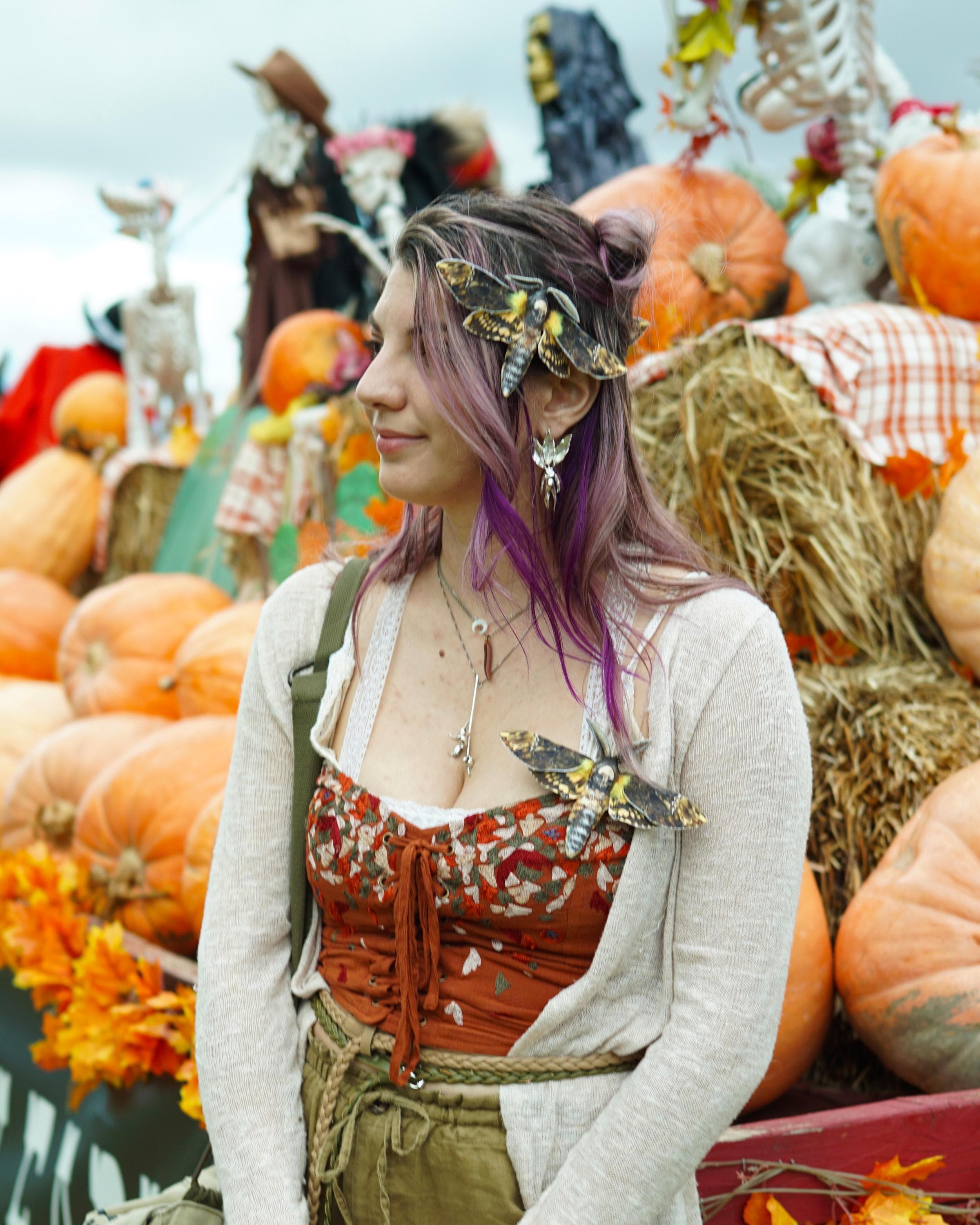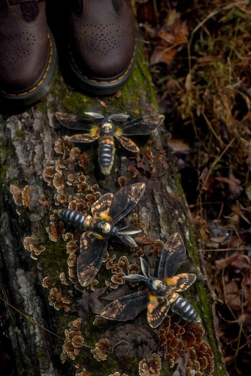 A fully handmade textile item based on the real death's-head hawk moth it has a soft body and a stylized skull on its head. It's a handmade, large, fake but realistic moth for your hair, as a brooch, or any other way you can think of! The wings are made from a soft fabric material and the fluffy body is faux fur with painted details to mimic the soft texture of a real moth. Made with all vegan materials. The inside of the wings are wired so they are flexible and poseable. This piece is one of a kind, wearable art!