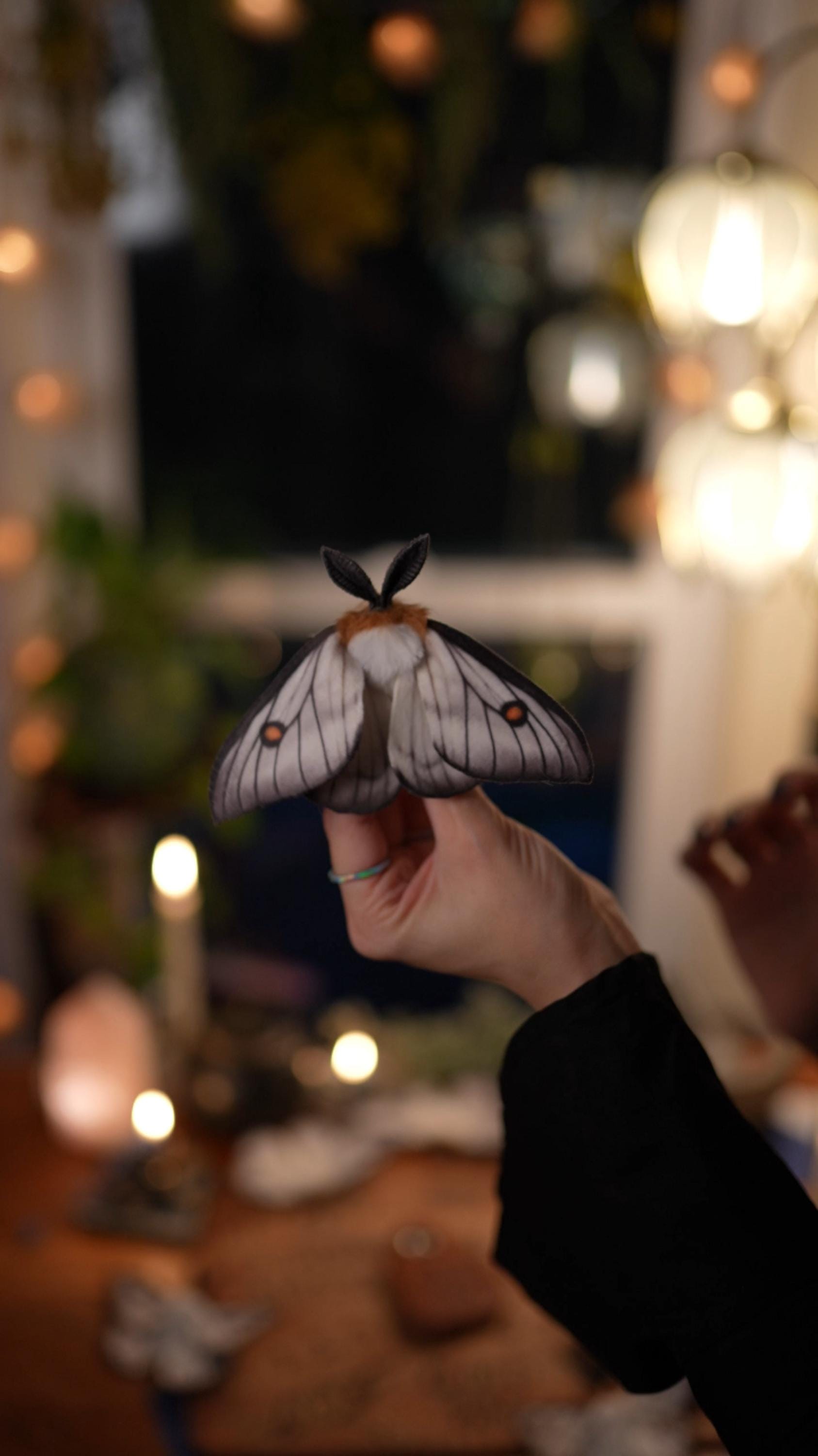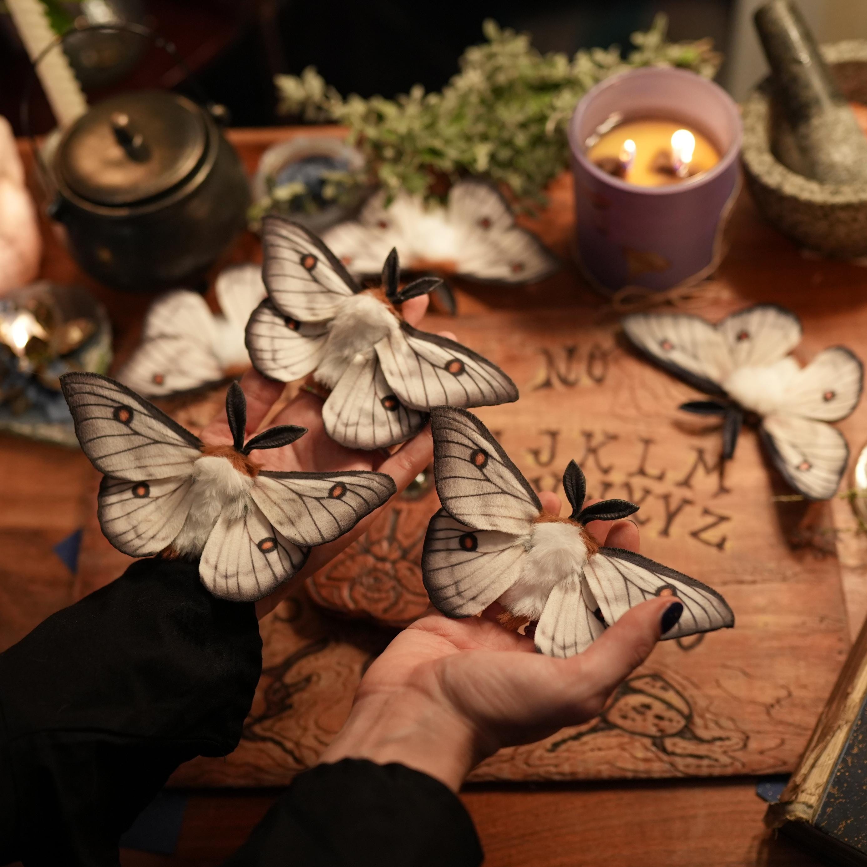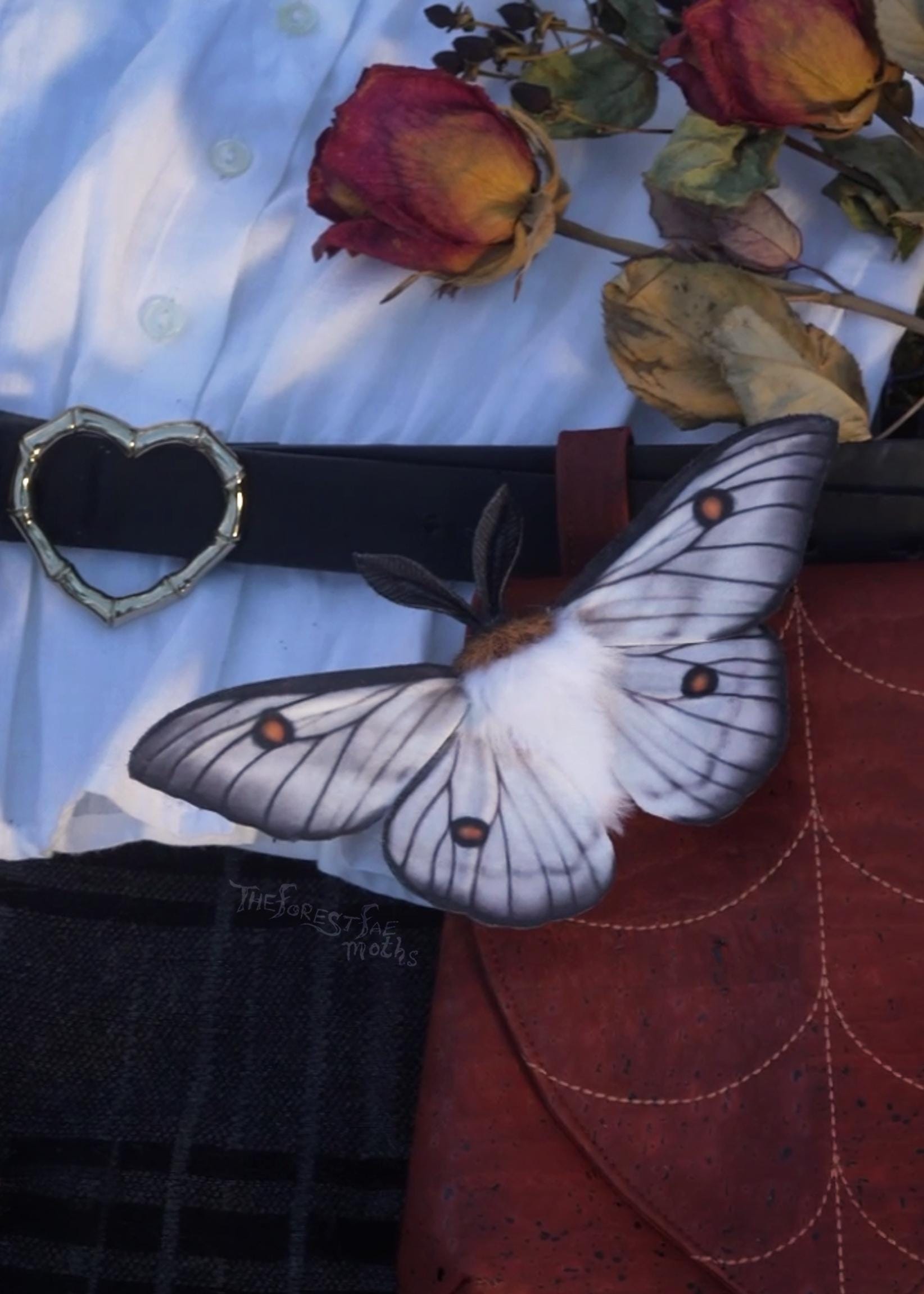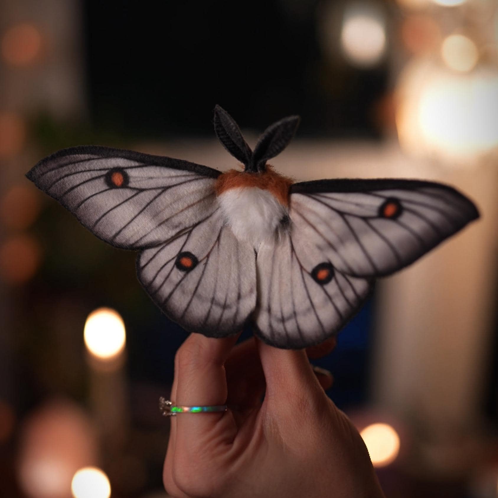 A large fake but realistic ghostly silk moth (ceranchia apollina), for your hair or anywhere else you can think! The moth is a handmade textile replica made to look like a real moth. The wings are made from soft velvety fabric and the body from faux fur. The inside of the wings are wired so they are flexible and poseable. A beautiful piece of wearable art.