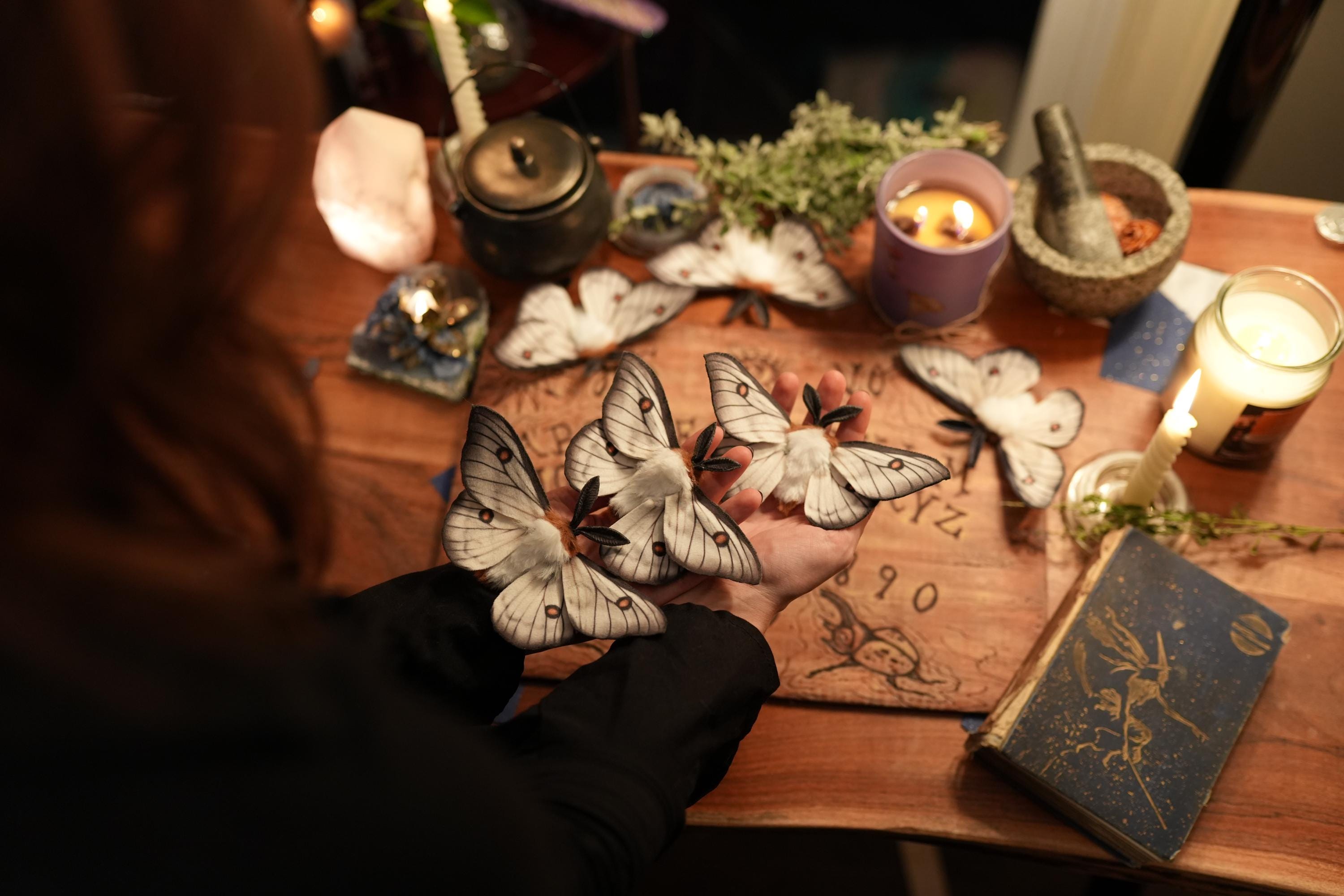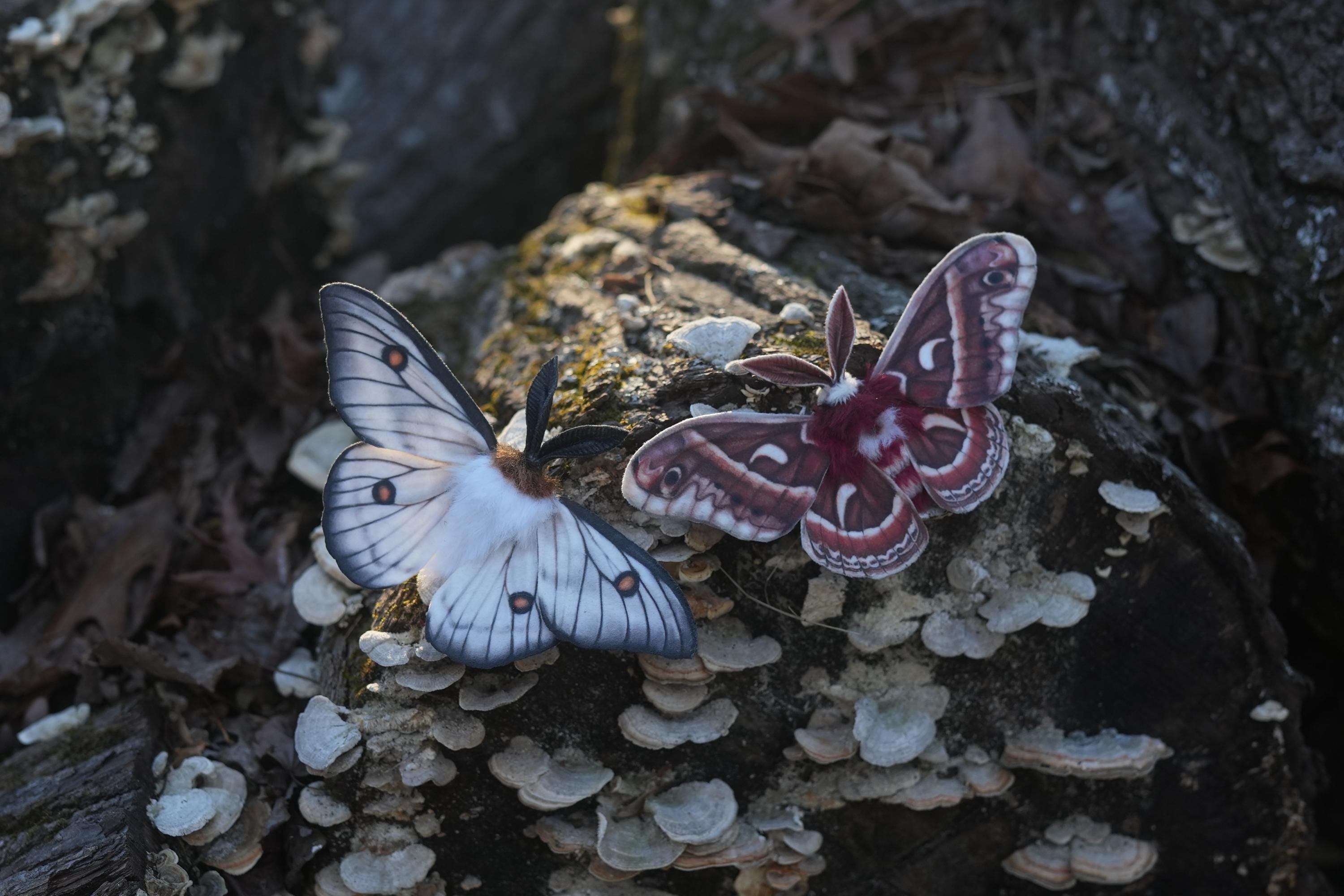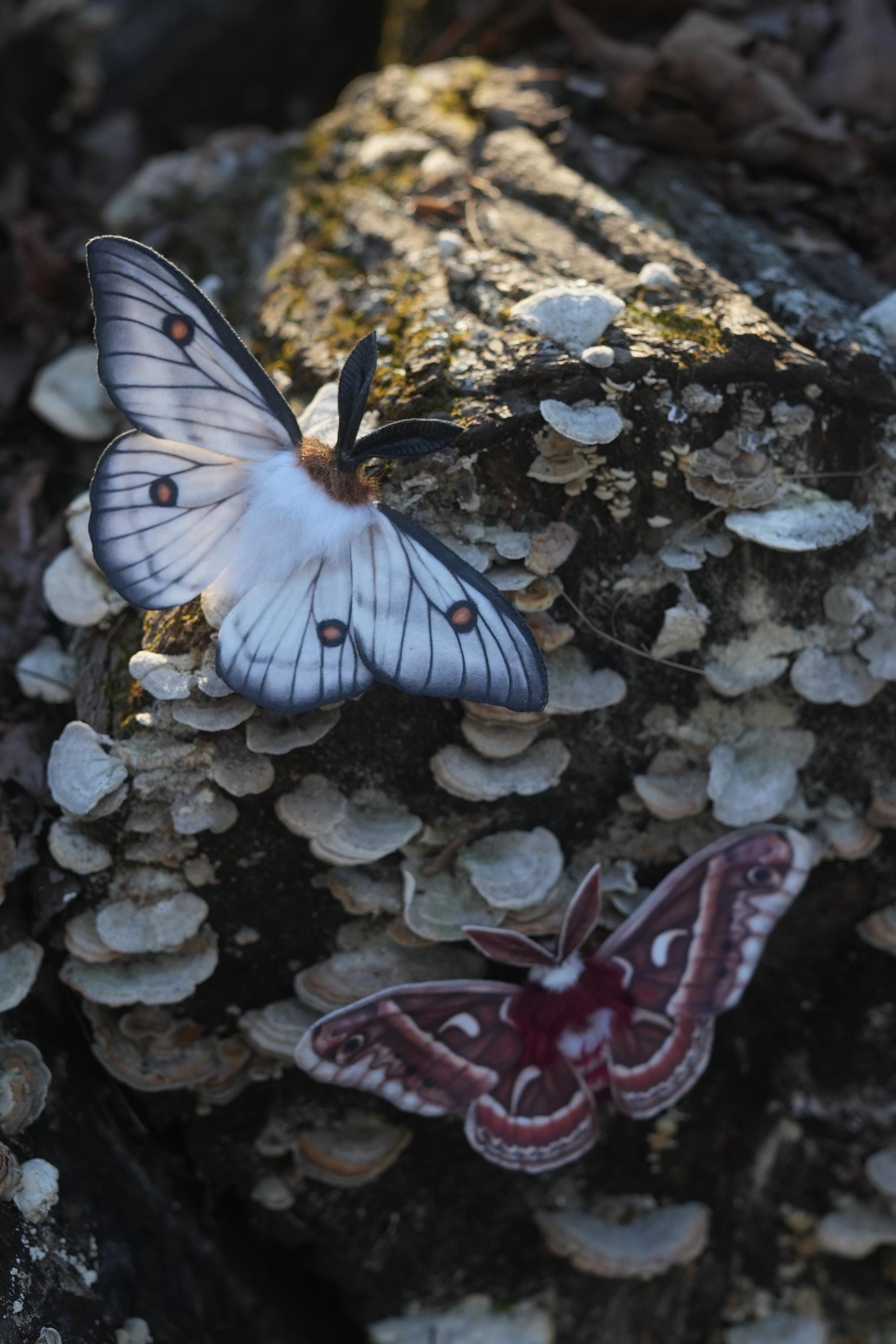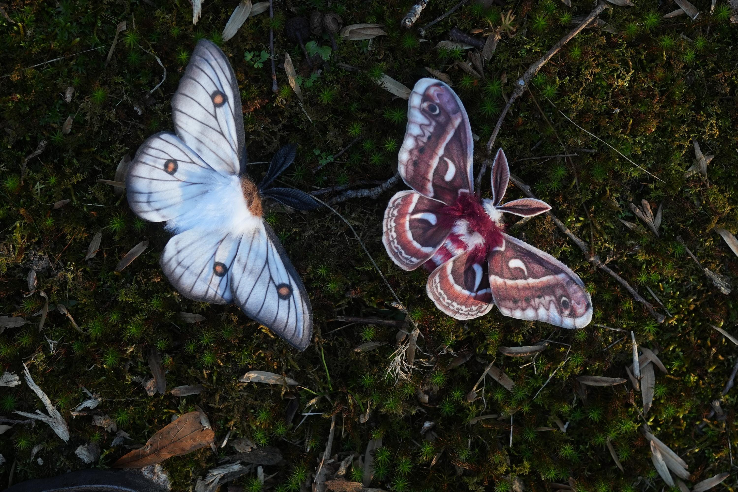 A large fake but realistic ghostly silk moth (ceranchia apollina), for your hair or anywhere else you can think! The moth is a handmade textile replica made to look like a real moth. The wings are made from soft velvety fabric and the body from faux fur. The inside of the wings are wired so they are flexible and poseable. A beautiful piece of wearable art.